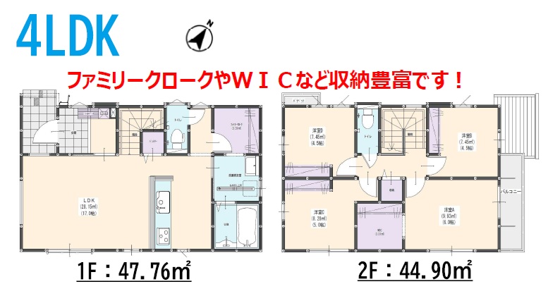 1階は約17.0帖のリビングイン階段。2階は、主寝室6.0帖+WIC・5.0帖・4.5帖・4.5洋室の4LDKの間取です。