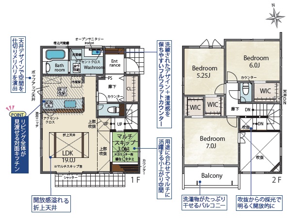 1階は約19.0帖+マルチスキップ付き・2階は、主寝室7.0帖、洋室6.0帖、5.25帖の3LDKです。