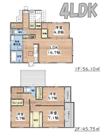 1階は約16.7帖+4.8帖の洋室付き。2階は、主寝室7.1帖+WIC・5.7帖・5.7帖洋室のオールフローリングの4LDKの間取です。