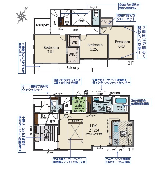 1階は約21.25帖・広々とした玄関スペース付き、2階は、主寝室7.0帖、洋室6.0帖、5.25帖の3LDKです。