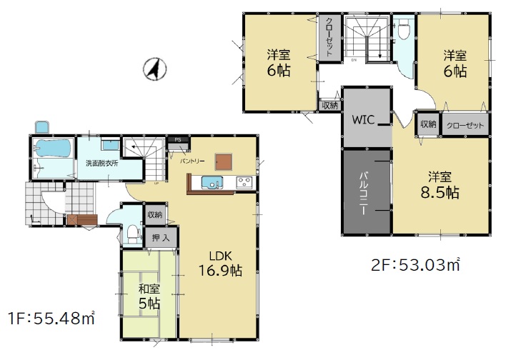1階は約16.9帖+5.0帖和室。2階は、主寝室8.5帖+WIC・6.0帖・6.0帖洋室の4LDKの間取です。