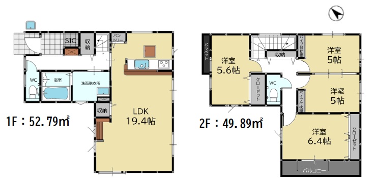 1階は約19.4帖+パントリー・スタディカウンター付き。2階は、主寝室6.4帖・5.6帖・10.0帖洋室の3LDKの間取です。