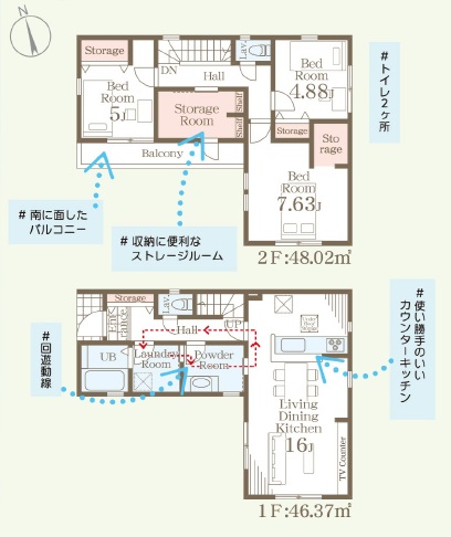 1階は、リビングダイニング約16.0帖でランドリールームもあります・2階の主寝室は、約7.6帖+WIC・5.2帖・4.8帖洋室・ストレージルームの3SLDKの間取りです。