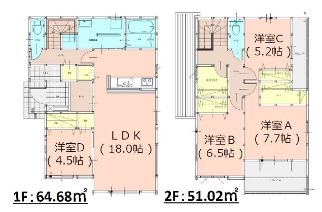 1階は約18.0帖+4.5帖の洋室付き。2階は、主寝室7.7帖+WIC・6.5帖・5.2帖洋室の4LDK+ファミリークローゼットの間取です。