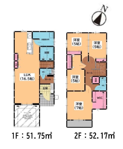 1階は約16.5帖のリビングイン階段。2階は、主寝室7.0帖+WIC・10.0帖・5.0帖洋室の3LDKの間取です。