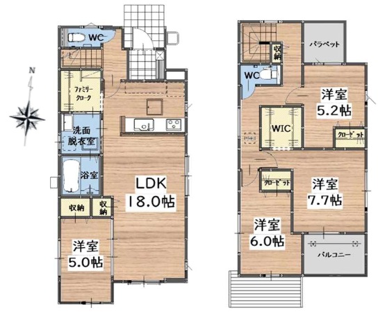 1階はLDK約18.0帖+4.5帖の洋室&ファミリークローク付き。2階は、主寝室7.7帖+WIC・6.0帖・5.2帖の4LDKの間取です。