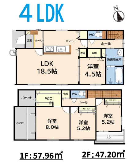 1階は約18.5帖+4.5帖の洋室。2階は、主寝室8.0帖+WIC・5.2帖・5.2帖洋室の4LDKの間取です。