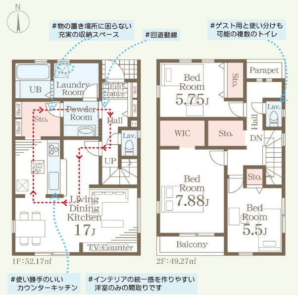 1階は、LDK約17.0帖&テレビカウンター付き・2階の主寝室は、約7.8帖+WIC・5.75帖・5.5帖洋室の3LDK間取りです。