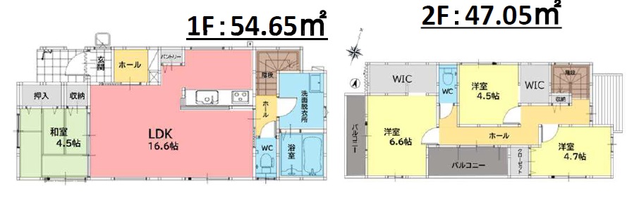 1階はLDK約16.6帖+約4.5帖の和室付き。2階は、主寝室6.6帖+WIC・4.7帖・4.5帖洋室の4LDKの間取りです。