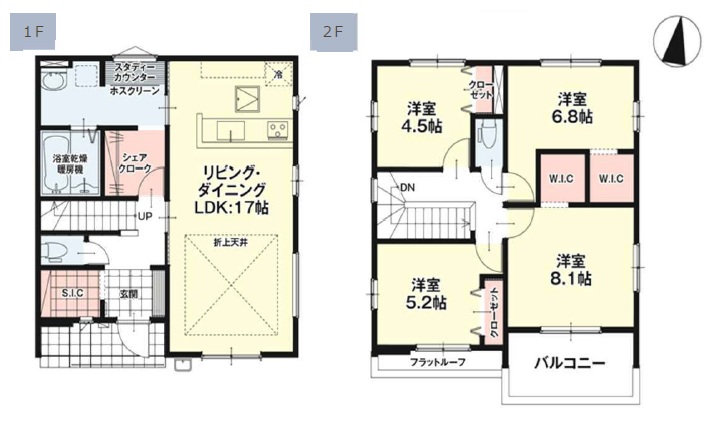 1階LDKが広々約17.0帖+洗面脱衣所には収納スペースも完備。2階は主寝室約8.1帖+WIC・洋室6.8帖・洋室5.2帖・洋室4.5帖の4LDKです。