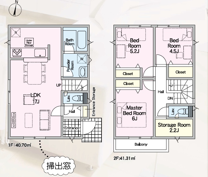 1階LDKが広々約17.0帖のリビングイン階段。2階は主寝室約6.0帖・洋室5.2帖・4.5帖+ストレージルームの3LDK。