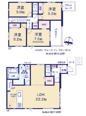 1階LDKが広々約22.2帖+WIC付き。2階は主寝室約7.5帖・洋室5.2帖・洋室5.2帖・洋室5.0帖の4LDKとなっています。