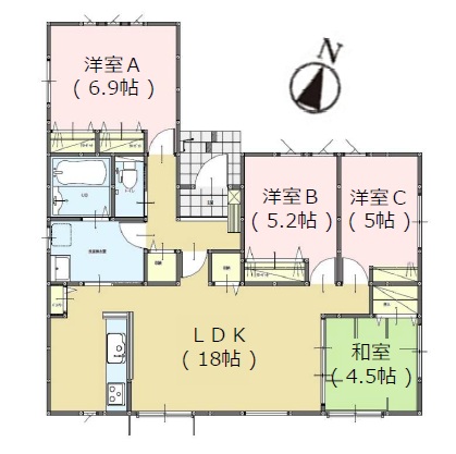 平屋の間取りで、LDKは約18.0帖+約4.5帖の和室付き。その他主寝室は約6.9帖・5.2帖・5.0帖洋室の4LDKです。