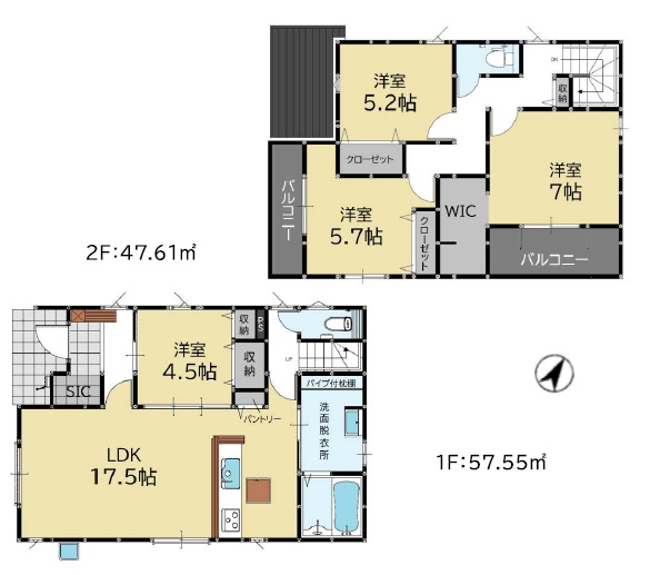 1階はLDK約17.5帖+4.5帖の洋室付き。2階は、主寝室7.0帖+WIC・5.7帖・5.2帖の4LDKの間取です。