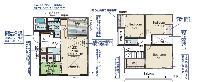 1階にはLDKが約20.0帖+約3.0帖の和室スペース付き、2階は、主寝室7.0帖+WIC、洋室5.25帖・5.25帖の3LDK吹抜け付きの間取りです。