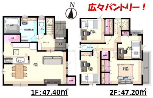 1階はLDKは約17.0帖+パントリー付き。2階は、主寝室6.5帖・5.0帖・4.5帖・4.2帖洋室の4LDKの間取です。