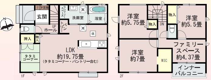 1階LDKは約19.75帖(畳スペース込)+パントリー付き。2階は、主寝室7.0帖+WIC・5.5帖・5.75帖洋室+ファミリースペース付きの3SLDKの間取です。