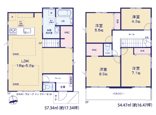 1階LDKが広々約23.2帖&WIC付き。2階は主寝室約8.5帖+WIC・洋室7.1帖・5.5帖・4.3帖の4LDK。