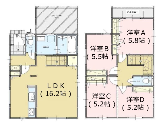 1階は約16.2帖+パントリー付きのリビングイン階段。2階は、主寝室5.8帖・5.5帖・10.4帖洋室の3LDKの間取です。