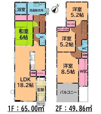 1階は約18.2帖+約6.0帖の和室付き。2階は、主寝室8.5帖+WIC・5.2帖・5.2帖洋室の4LDKの間取です。