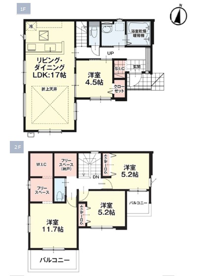 1階LDKが広々約17.0帖+約4.5帖の洋室付きです。2階は主寝室約11.7帖+WIC+フリースペース・洋室5.2帖・洋室5.2帖の4LDKです。