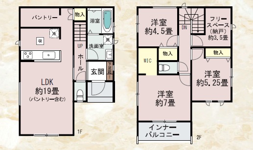 1階はLDKは約19.0帖+パントリー収納付き。2階は、主寝室7.0帖+WIC・5.25帖・4.5帖洋室の3LDK+フリースペース付きの間取です。