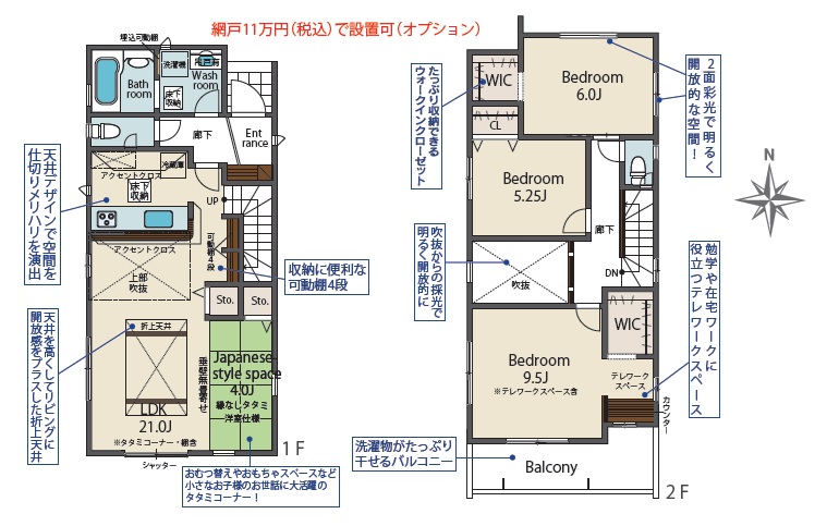 1階には約21.0帖のLDK+4.0帖の和室付き。2階は、主寝室9.5帖+WIC&テレワークルーム付き、洋室6.0帖・5.25帖の3LDKの間取りです。